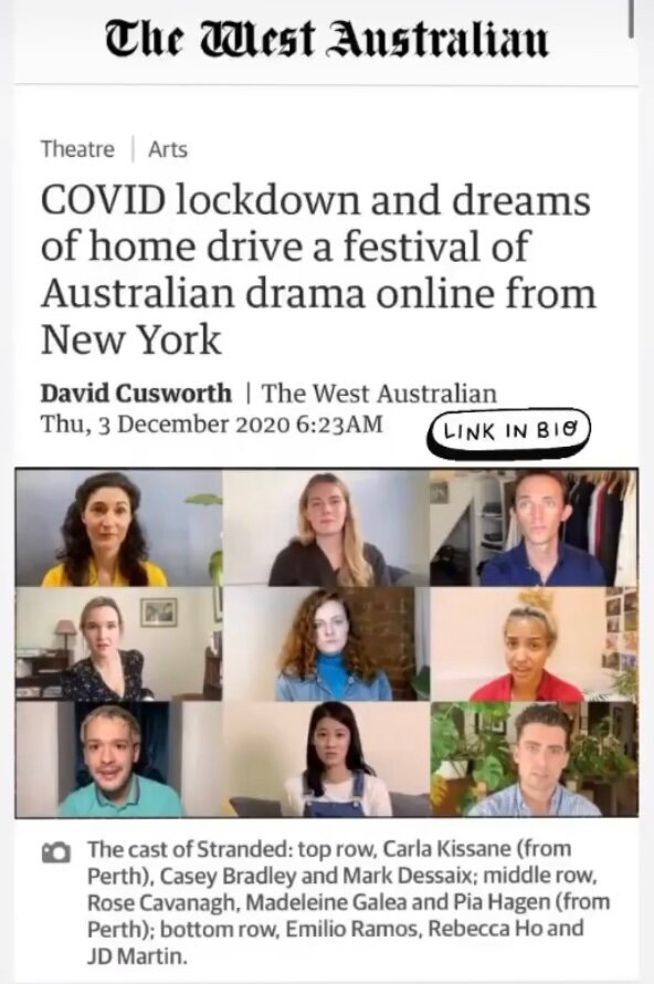 Press for ‘Stranded’ with Australian Theatre Festival NYC, from West Australian Newspaper: https://thewest.com.au/entertainment/theatre/covid-lockdown-and-dreams-of-home-drive-a-festival-of-australian-drama-online-from-new-york-ng-b881738220z?fbclid=IwAR2fyCrSOJDCRSkw610dwTWZQQ7igUnU9KS4C7yO9r7VGdf2pOfDpeypcro